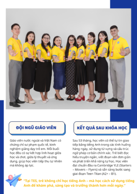 Giai đoạn 6–12 tuổi là “thời điểm vàng” để trẻ tiếp thu ngoại ngữ. Chương trình Tiếng Anh Thiếu Nhi tại TES được thiết kế theo chuẩn Cambridge (Starters – Movers – Flyers), giúp các em: